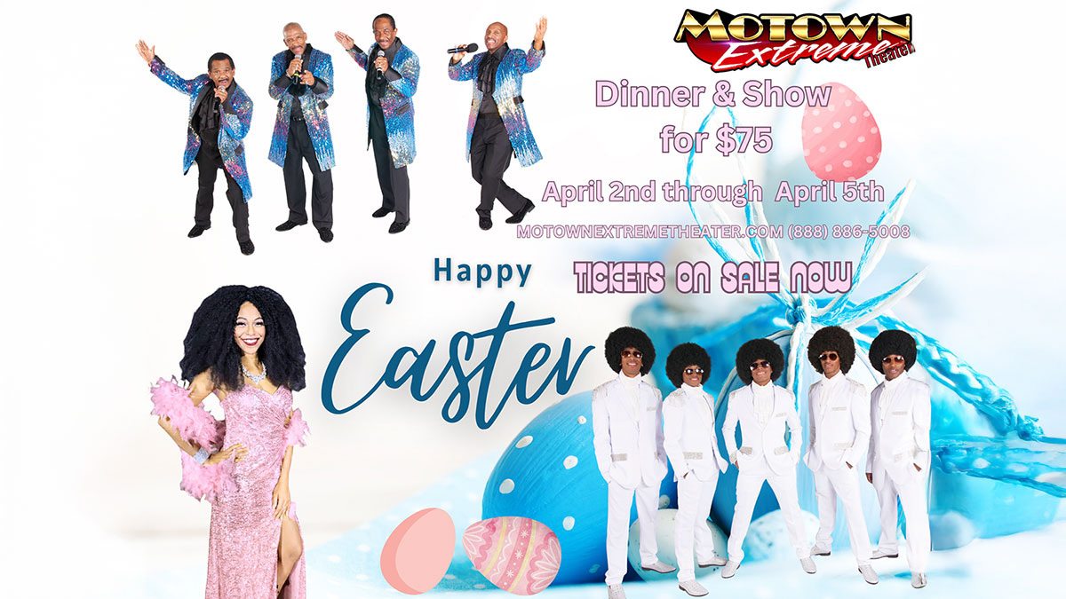 Gather the family and step into the groove at Motown Extreme Theater for our special Easter event! Get the ultimate Vegas holiday experience: a delicious, soulful pre-show dinner paired with a ticket to our high-energy tribute show.
